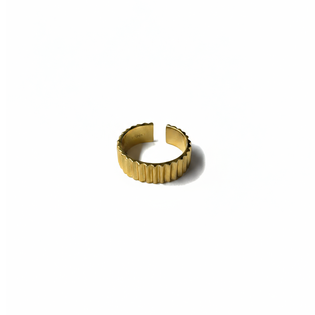 The Sorrento ring features 18k gold plating, blending sleek mid-century design with a contemporary edge for a sophisticated statement.